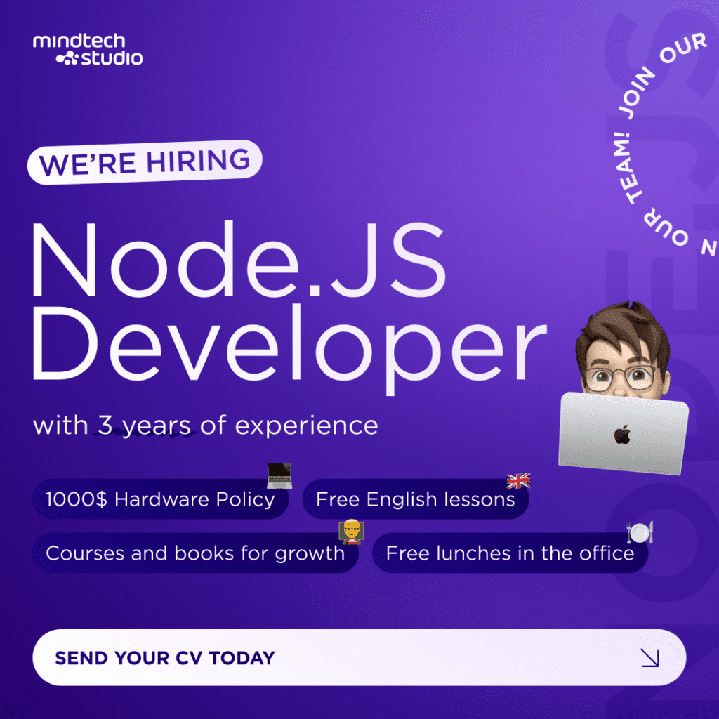Mindtech Studio needed to create an image for a Node.JS developer search ad in three sizes. The client wanted to place Memoji on the advertisement, indicate several advantages of the company, keep the corporate style, and have a modern look.