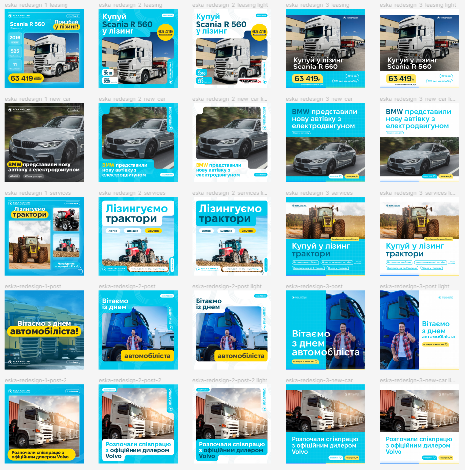 There were no special requests from the client, but the client noted that he wanted to see the Instagram feed in corporate colors. Based on this, I created 5 different design variations for 5 areas: a post with actual machinery for sale, a news post, a post about services, and a congratulations post.