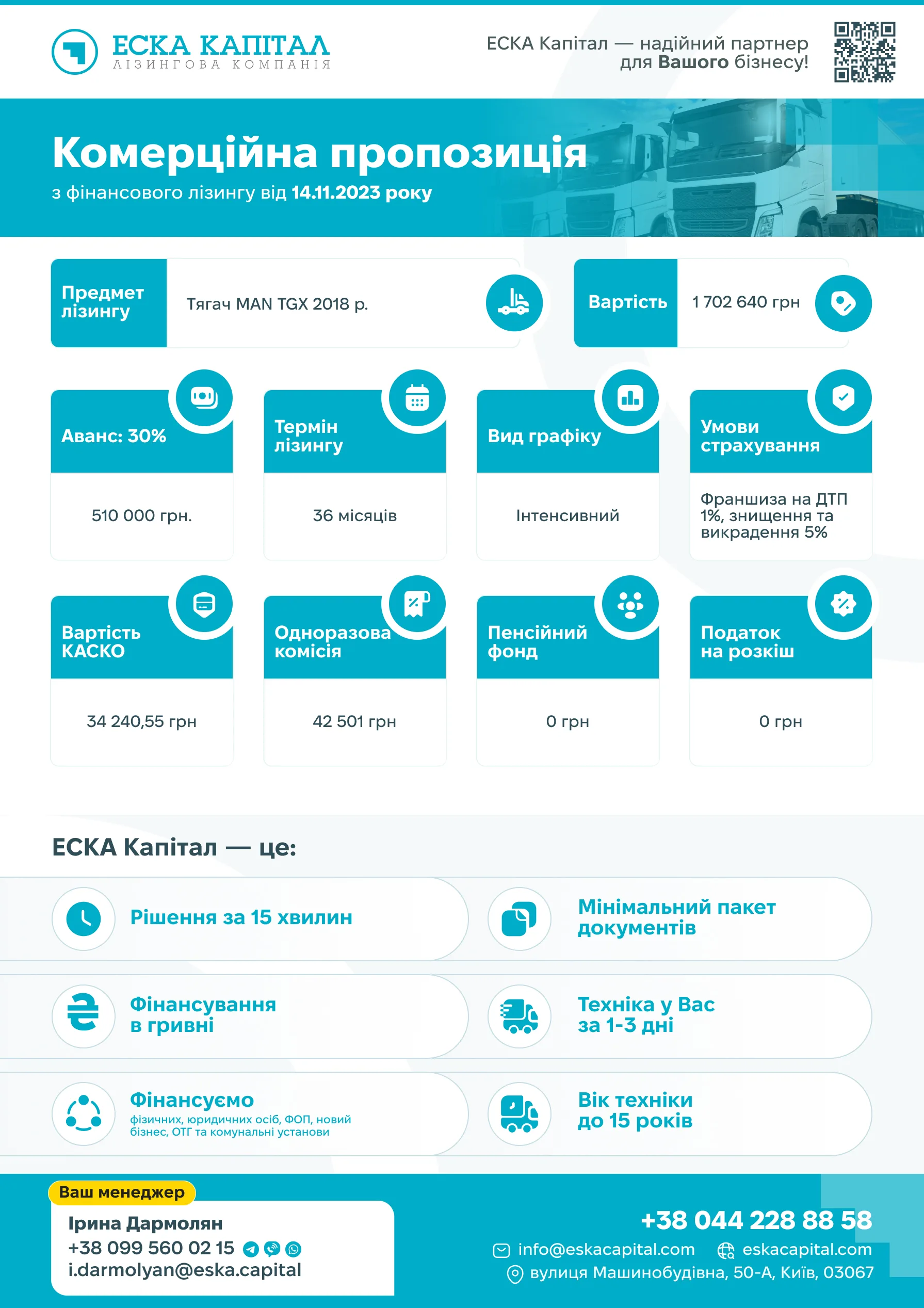 So, in the final result, all these issues were resolved, the contacts of the company and the manager who takes care of the client were indicated at the bottom of each page, and the design became more streamlined and consistent with the new style of the company.