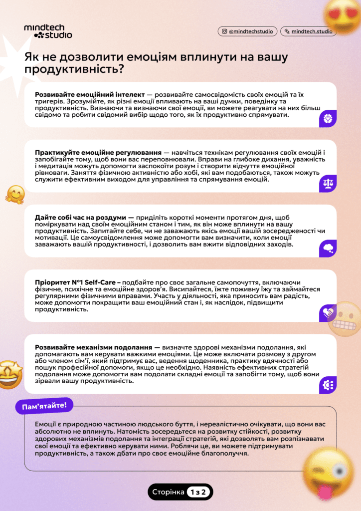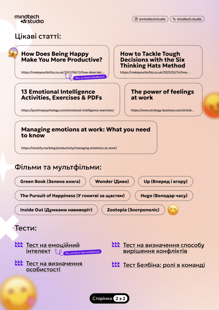 In the style of the event held by the Mindtech Studio team, which was dedicated to emotions while working in a team, it was necessary to develop a two-page design with useful materials on the topic under discussion.