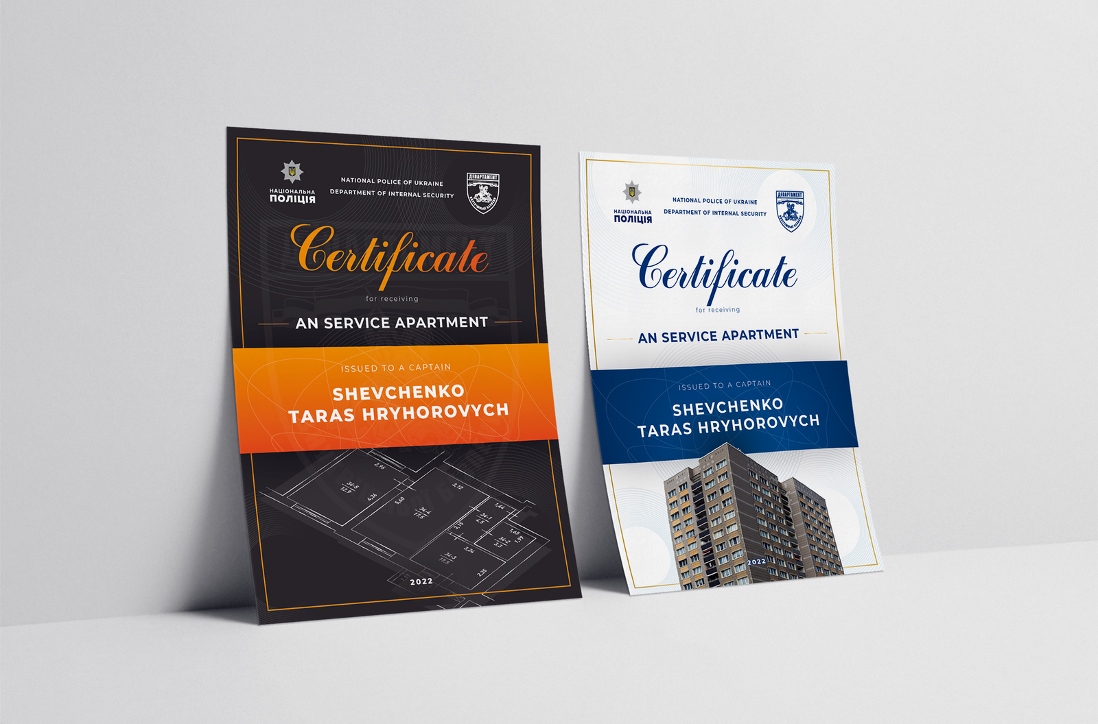 I had the opportunity to work on a small but exciting project for the Department of Internal Security of the National Police of Ukraine. The goal was to design personalized certificates for the recipients of office apartments. The certificates were to be given as a recognition of their service and dedication to the department.